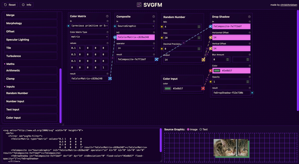 I love SVG so much, but its filters are a little complex to wrap my smooth brain around… so to make it a little easier, I built a tool to dynamically build an SVG filter with a GUI. An SVG Filter Maker, or SVGFM, for short…